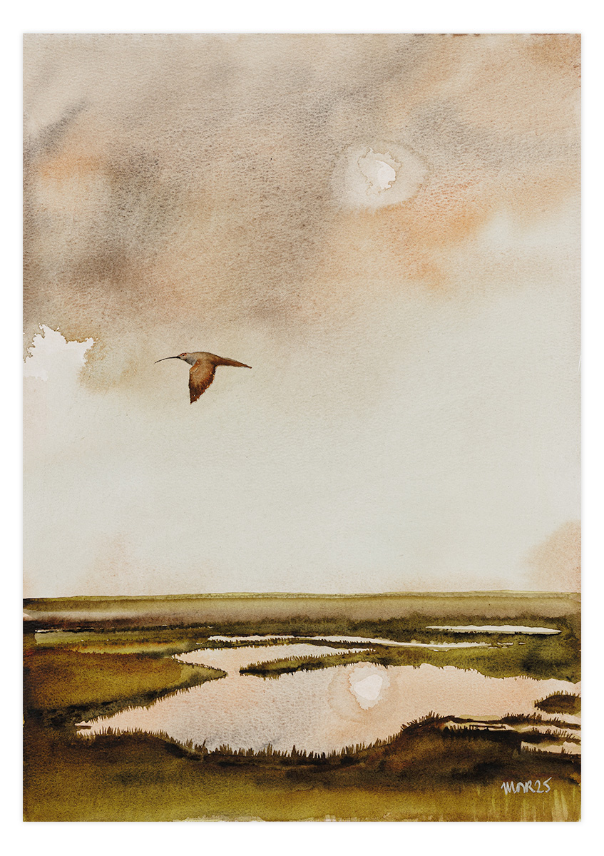 A curlew flying low over the marshes, painted in soft washes that let the sky, water and grasses blur into one quiet landscape. Each work catches a different shift of light, with the bird held in that still moment between land and sea.