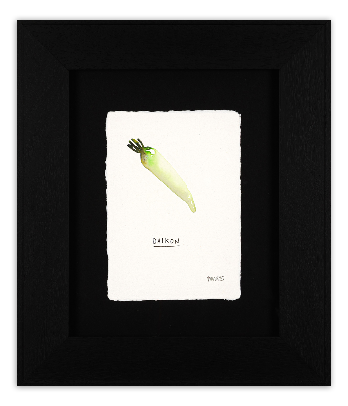 From Jim Moir’s Scran series. A pale green daikon painted with delicate washes and subtle detail.