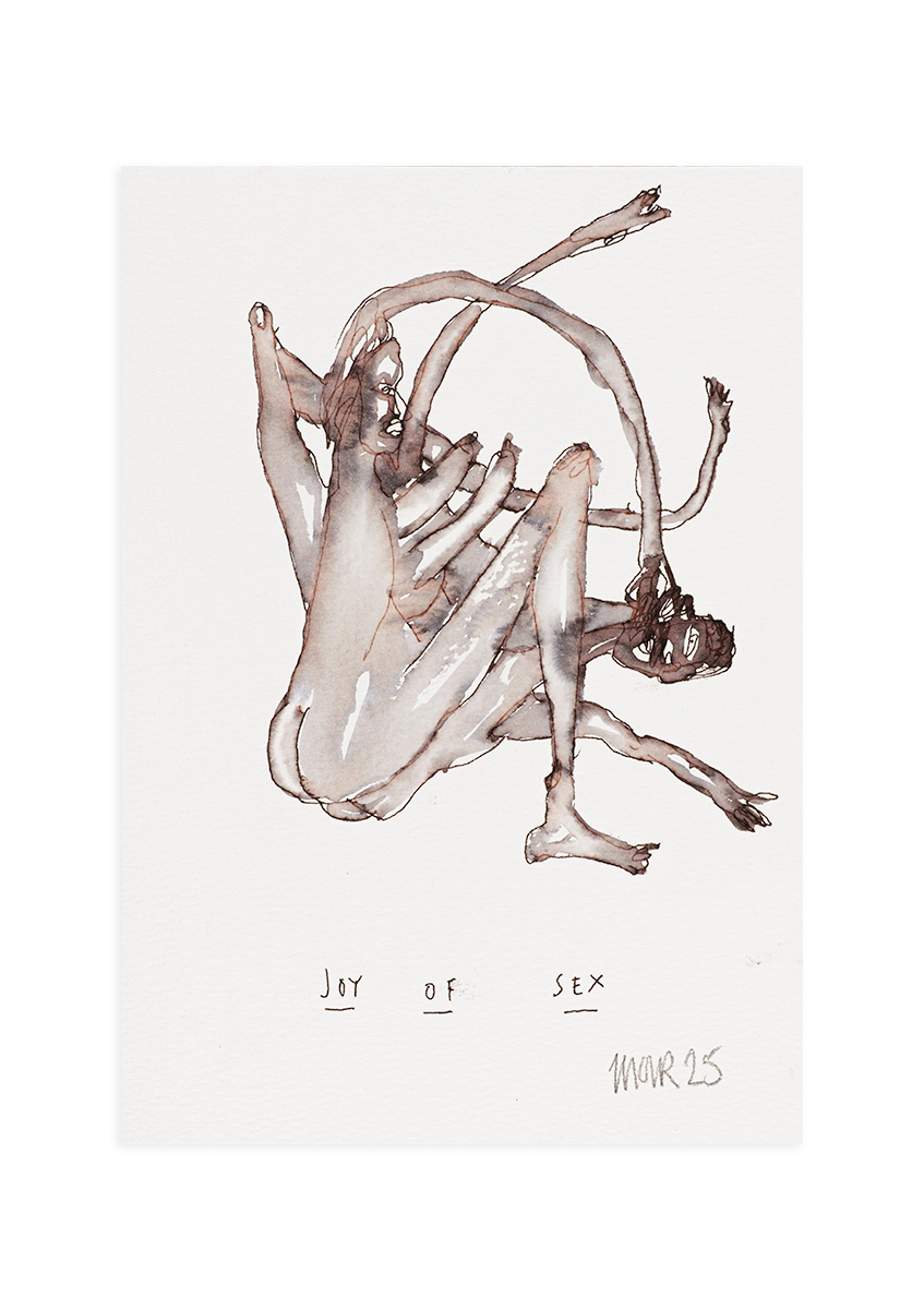 A tangle of bodies and limbs drawn in Jim’s loose pen line, washed with soft ink tones that keep things more absurd than explicit. These smaller originals continue his Joy of Sex series in a more intimate format, each one its own awkward, knotted embrace.