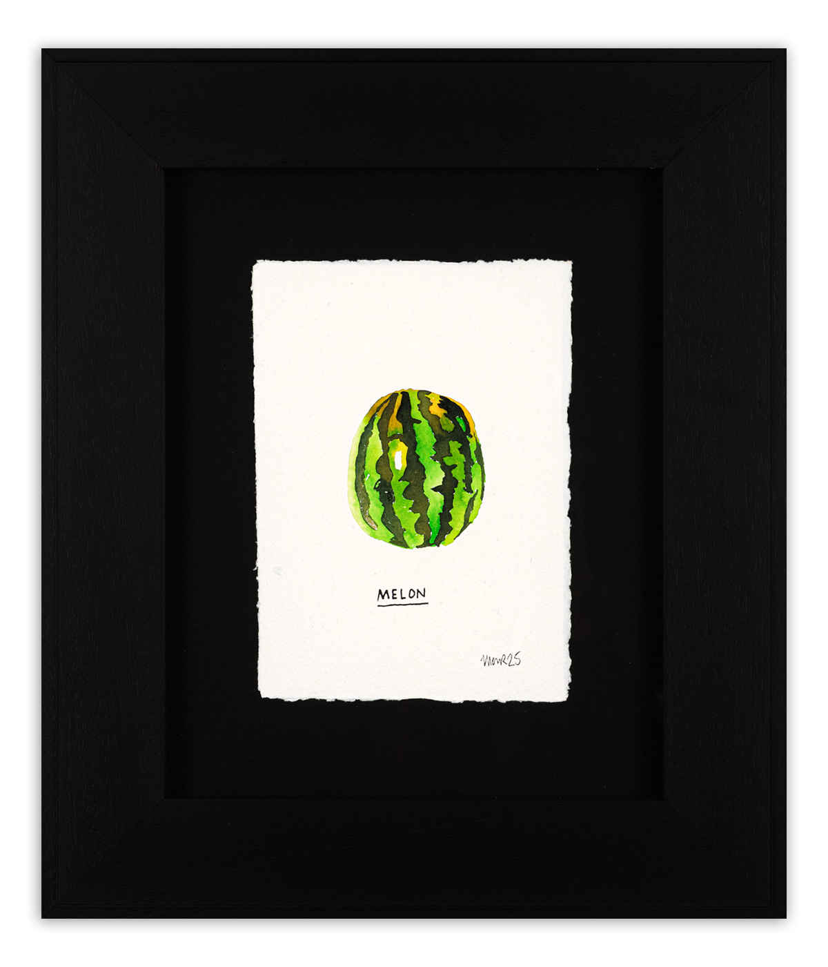 From Jim Moir’s Scran series. A bold green melon painted with vibrant stripes and simple charm.