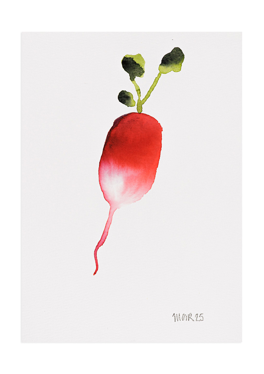 A bright watercolour radish painted with soft blends and loose leafy detail.