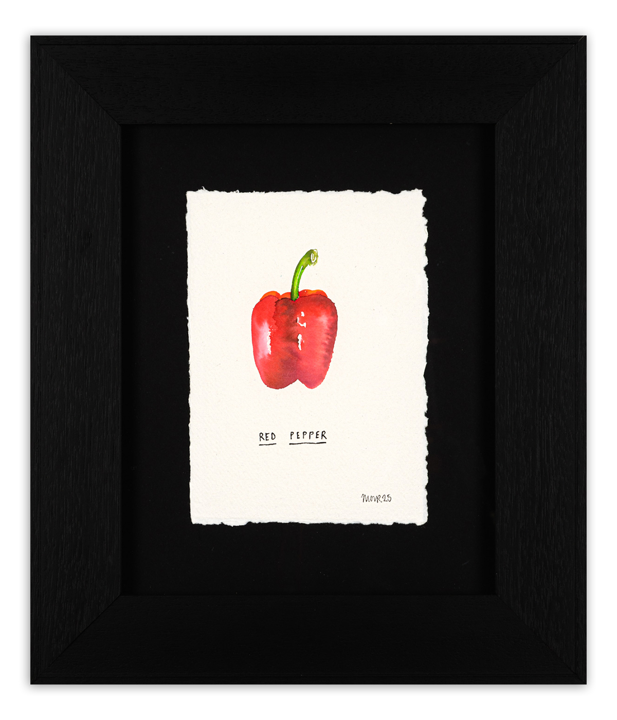From Jim Moir’s Scran series. A bright red pepper painted with clean colour and soft edges.