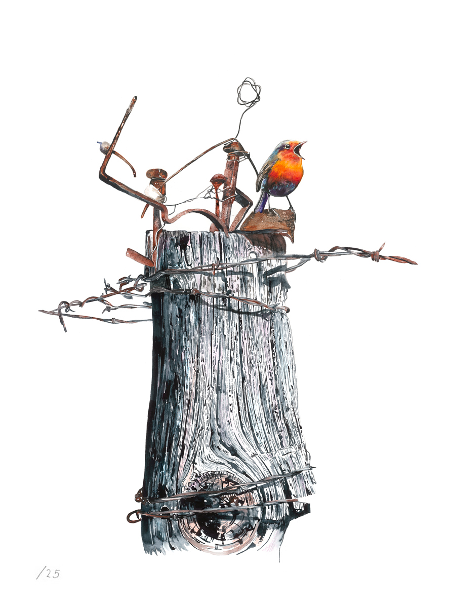 A bright robin singing from a weathered fence post, perched among rusted wire and bent metal – a burst of colour against all that battered wood and iron.
