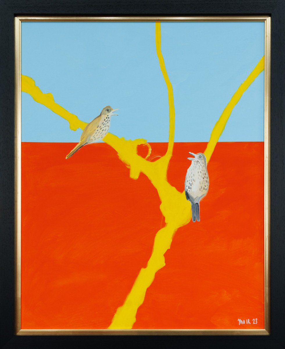 Two thrushes sing out against a striking backdrop of bold colour fields — a vivid red ground with branches of bright yellow cutting through the scene beneath a pale blue sky. The natural detail of the birds contrasts with the abstract intensity of their setting, creating a painting that feels both modern and timeless.