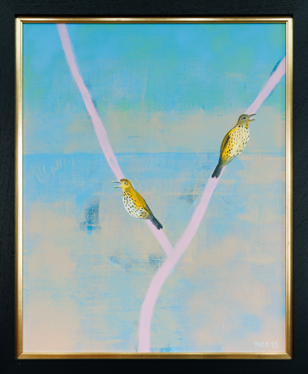 Two thrushes perch on soft pink branches, their speckled forms set against a dreamlike wash of blue and dusky light. The composition is at once delicate and bold, balancing the birds’ natural detail with an abstract, almost surreal backdrop. A work that evokes both stillness and song as daylight fades.