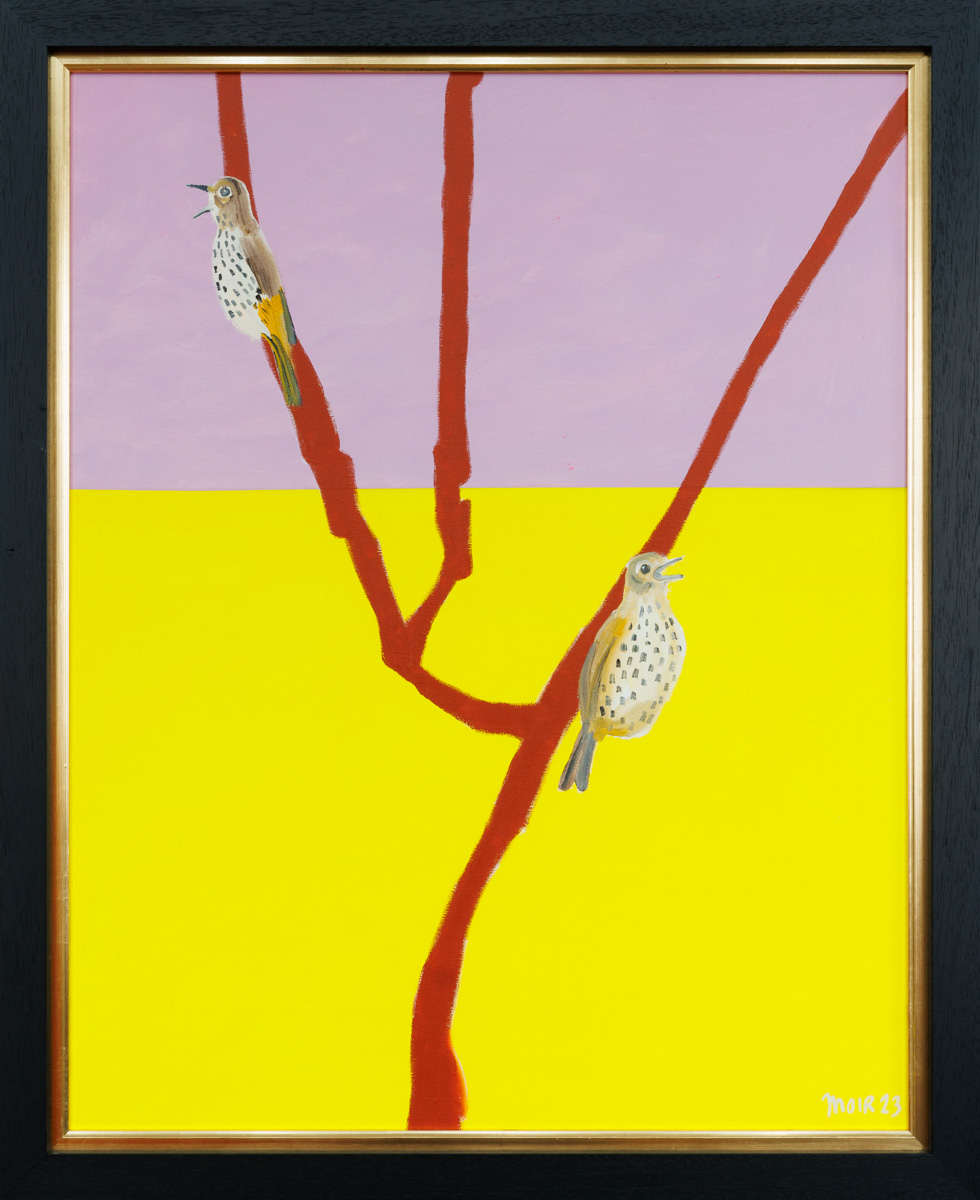 Two thrushes herald the day against a striking plane of yellow and soft violet sky, perched on red branches that cut boldly through the canvas. Their speckled chests and open beaks bring life and sound into a composition that balances sharp abstraction with the gentle rhythms of the natural world.