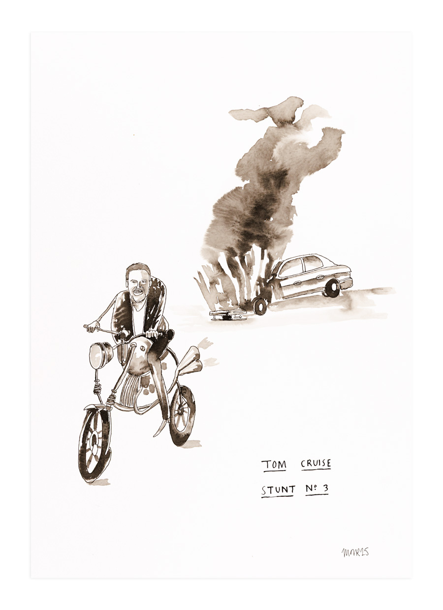 Motorbike, explosion, grin — all the essentials are here. In Tom Cruise Stunt No. 3, Moir’s ink washes bring cinematic chaos to life with tongue firmly in cheek.